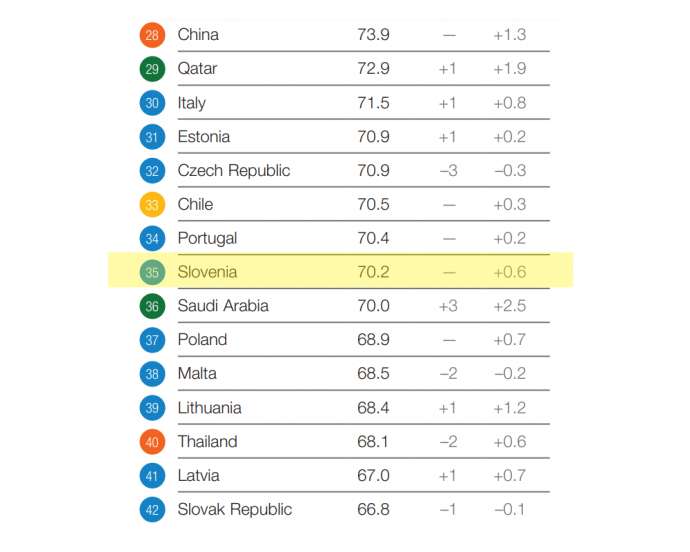 STA, 9 October 2019 - Slovenia remained 35th in the latest World Economic Forum's Global Competitiveness Report, scoring 70.2 points on a scale from 0 to 100, up from 69.6 points last year. It ranks just behind Portugal and ahead of Saudi Arabia, while Singapore claimed the throne of the most competitive among 141 countries.